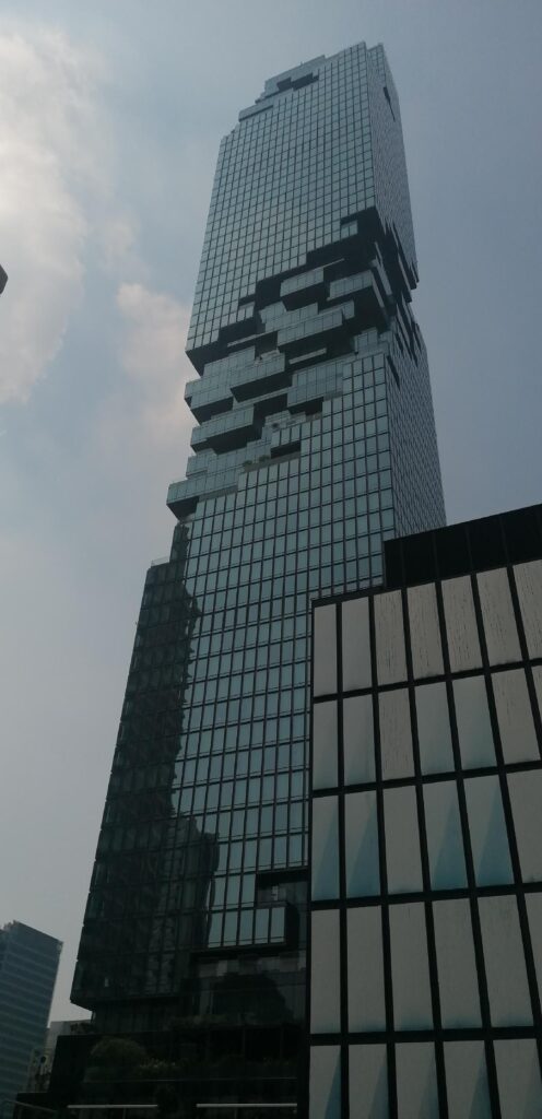 Έπειτα από λίγες μέρες η ατμόσφαιρα κάπως καθαρίζει, οπότε ανεβαίνω στο πολυώροφο κτίριο King Power Mahanakhon. Με 77 ορόφους πολλαπλών χρήσεων, όπως γραφεία, πανάκριβες κατοικίες και ξενοδοχείο, είναι το πιο ψηλό της πόλης. Το υπερμοντέρνο ασανσέρ φωτίζεται θεαματικά. Στο ίδιο εισιτήριο περιλαμβάνεται και έκθεση με διάφορα laser shows και οπτικές απάτες που δημιουργούνται από αυτά, σε χαμηλότερο όροφο.