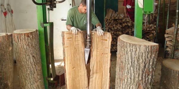 Οι κύλινδροι που έχουν επιλεχθεί μεταφέρονται στο πριονιστήριο για το πρώτο στάδιο της κατεργασίας τους, που είναι το σχίσιμο. Οι κορμοί δεν κόβονται με πριόνι (όπως συνηθίζεται στις βαρελοποιίες της Αμερικής), αλλά σχίζονται κάθετα, ούτως ώστε αν υπάρχουν ρωγμές ή ρόζοι στη σάρκα του κορμού να αποκαλυφθούν και τα μέρη αυτά να εξαιρεθούν.