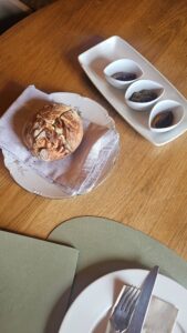 Το γεύμα μας στο εστιατόριο Μουριές ήταν γεμάτο με γεύσεις του τόπου: μυρωδάτες ελιές και ντομάτες σε διαφορετικές υφές, ζυμωτό ψωμί στο οποίο δεν μπορείς να αντισταθείς, φρέσκια σαλάτα με λαχανικά από τους κήπους του ξενοδοχείου και, για κυρίως, η απόλυτη γιορτή των αισθήσεων: ανοιχτή πίτα με μυρωδικά του τόπου και burger που φέρνει τη σύγχρονη μαγειρική με τα πιο εκλεκτά υλικά σε απόλυτη αρμονία.